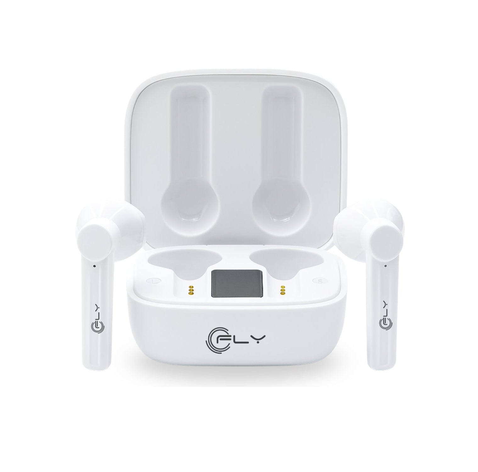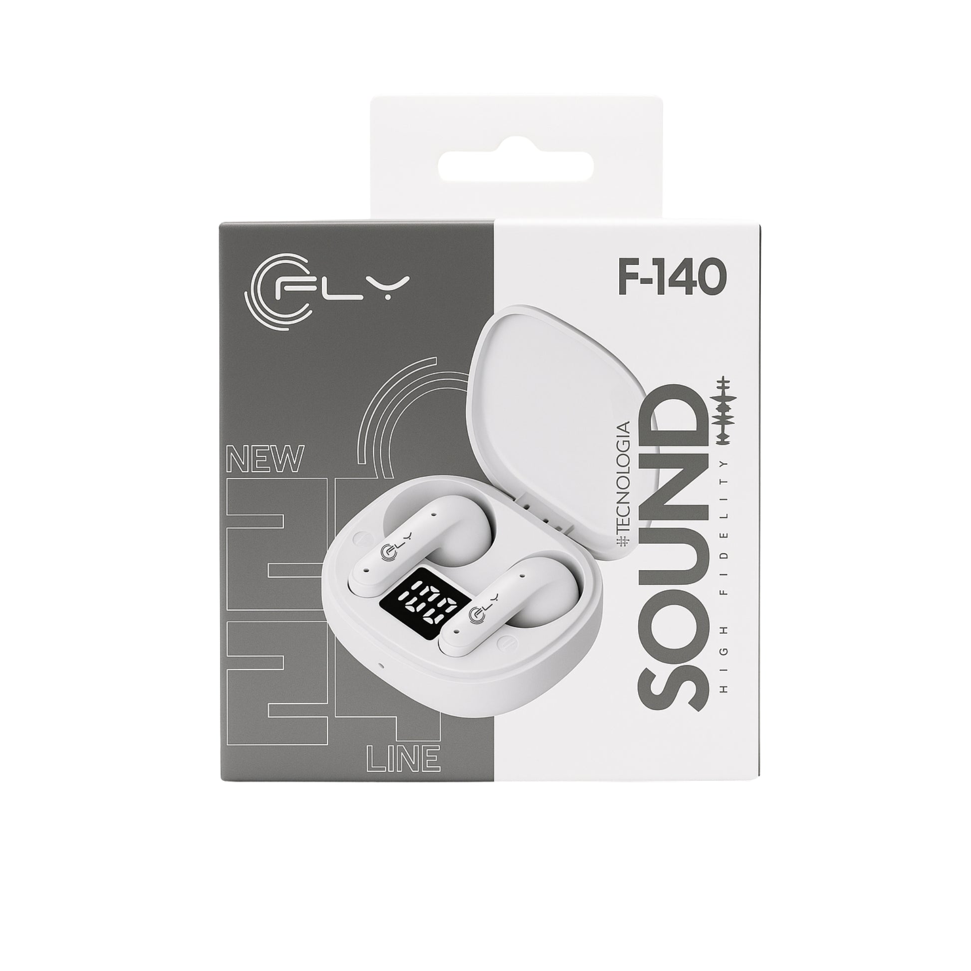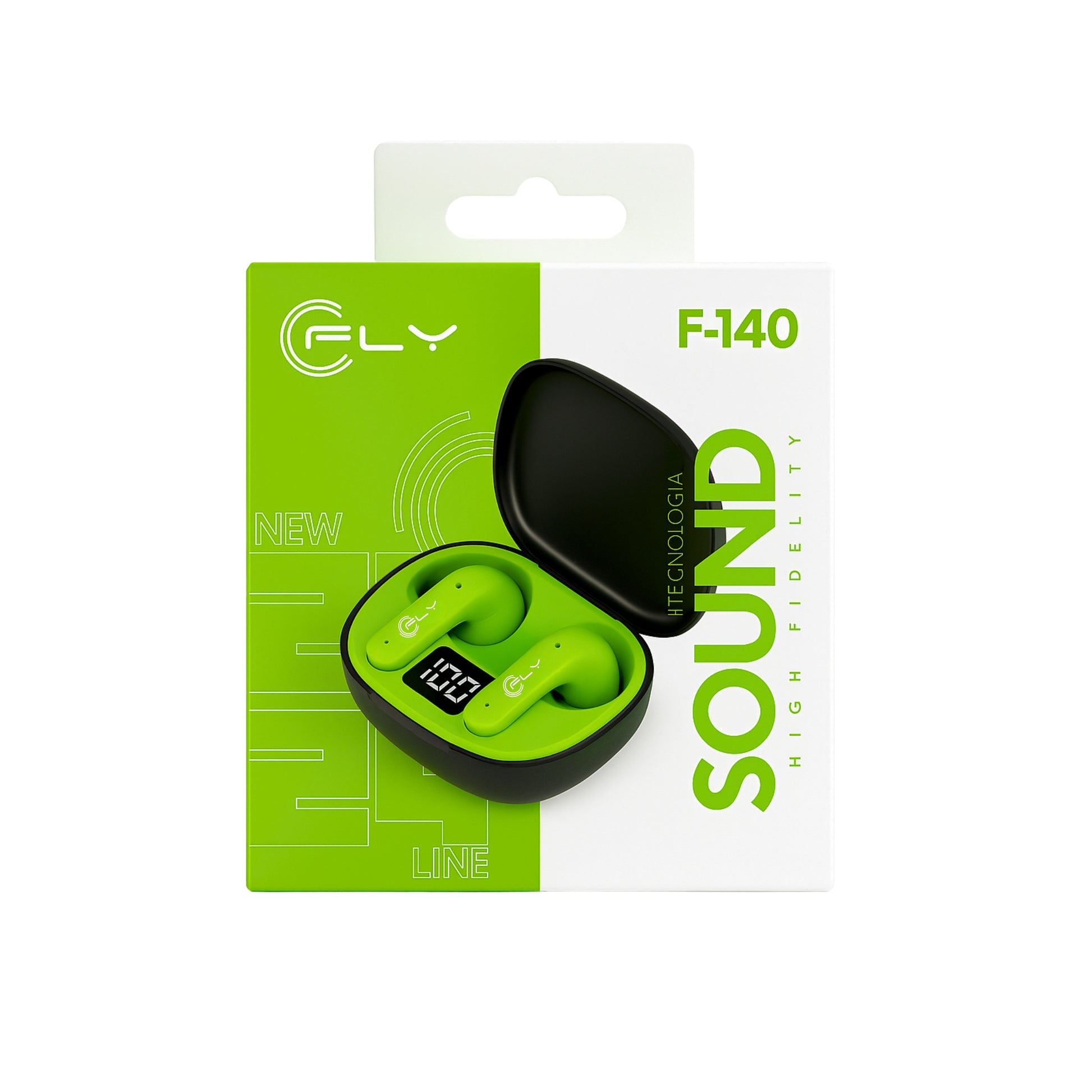 - Un par de audífonos FLY F-140, estuche de carga con pantalla, cable de carga Tipo C, manual de usuario y garantía del fabricante.